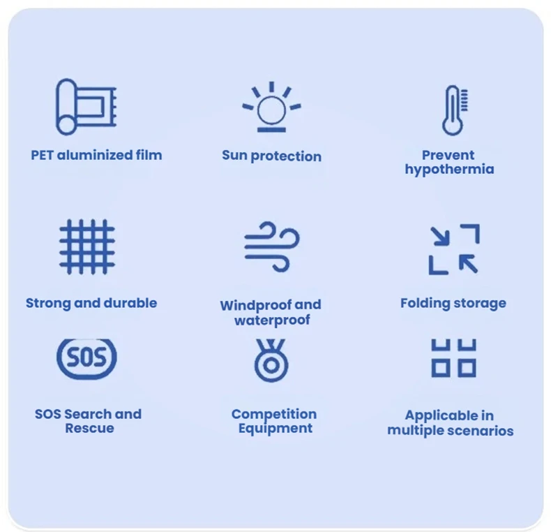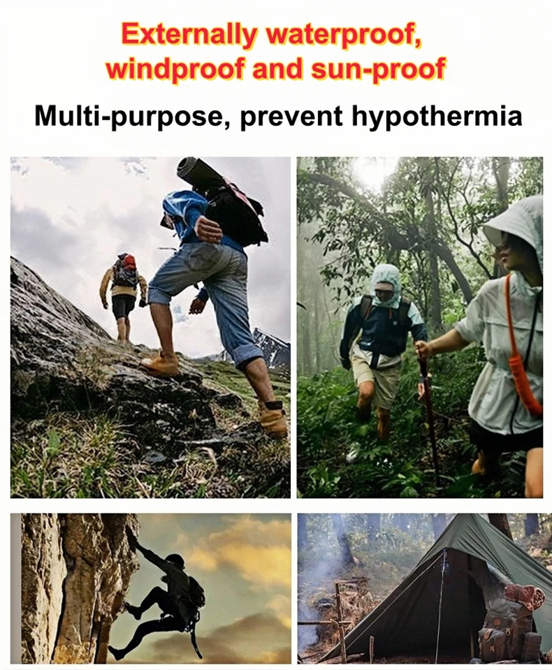 4.Heat retention in low temperatures: In cold environments, the giant space blanket can retain 80-90% of body heat, preventing it from dissipating. The strong reflection also makes it easier for rescuers to locate it. It is an indispensable tool for outdoor survival.
