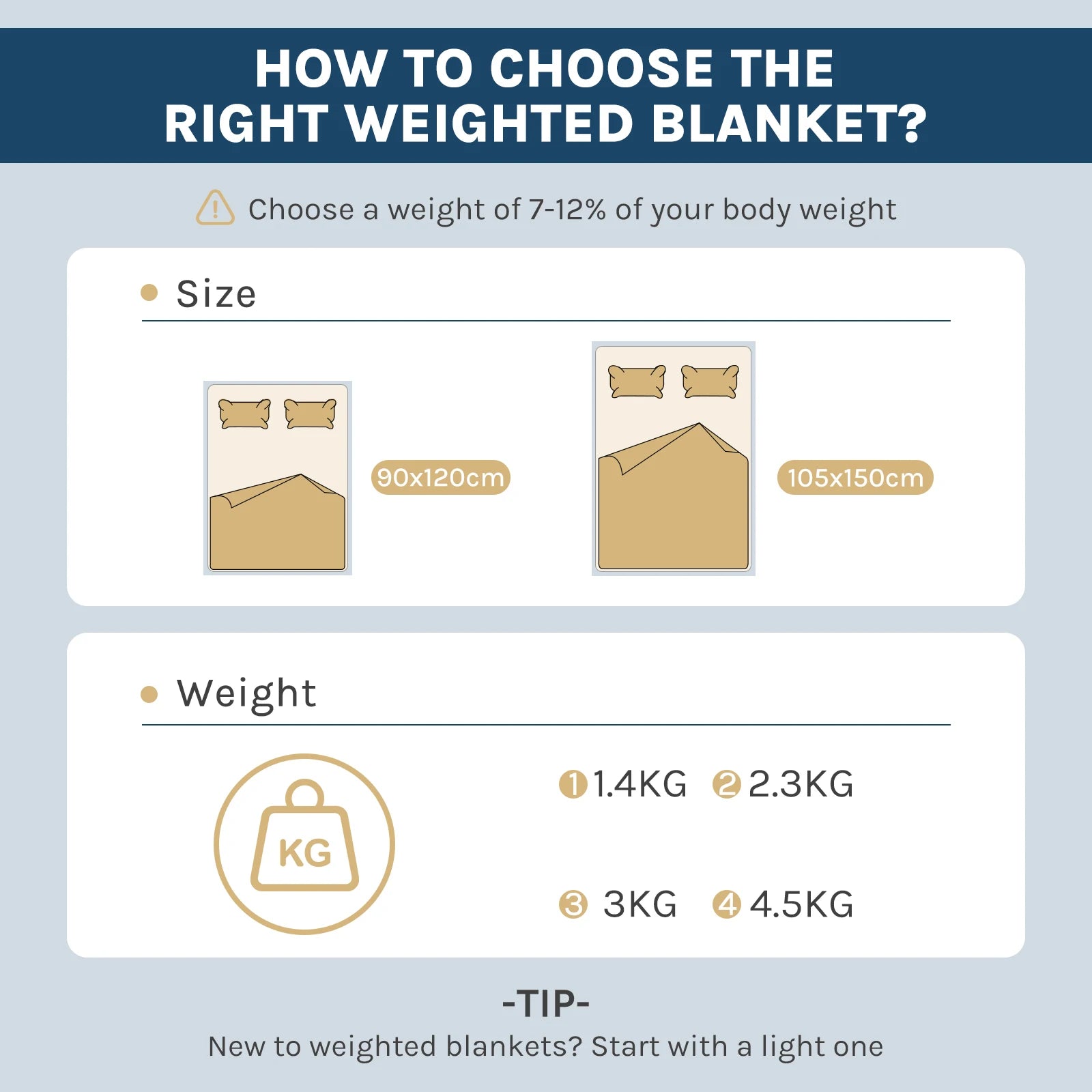 Tip for the right think: This weighted blanket is available in 4 different weights and corresponding sizes; for optimal sleep, it is recommended to choose a blanket that weighs 7-12% of your body weight. If you use the blanket with weight for the first time, it is better to choose a lighter one, as it usually takes about a week to get used to the weighted blanket